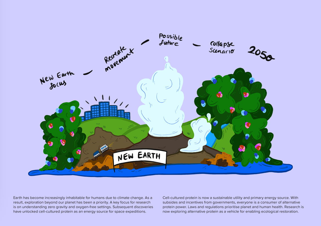 Synthesised twelve prototype ideas into four illustrated future scenarios, premiumise, feed the masses, post-food, and new earth, spanning food, agriculture, and entirely new domains